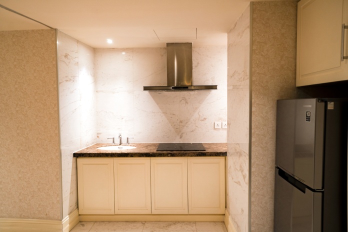 Полулюкс-студия: отдельная спальня с двуспальной кроватью, отдельная гостиная с обеденной зоной и отдельная кухня с плитой, вытяжкой и раковиной, отдельной ванная комната с душевой кабиной и стеклянной стеной со шторкой; вид на город;