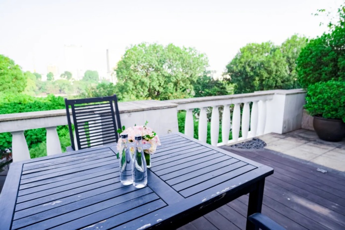 Номер премиум-класса на верхнем этаже: отдельная спальня с двуспальной кроватью king size, отдельная просторная гостиная, отдельная ванная комната с ванной и душевой кабиной; меблированная терраса с собственным небольшим садом, вид на город с высокой точки.