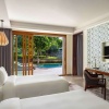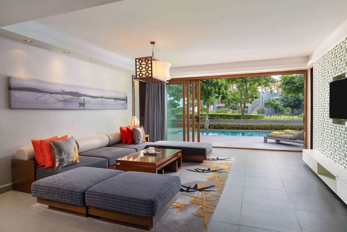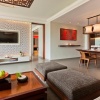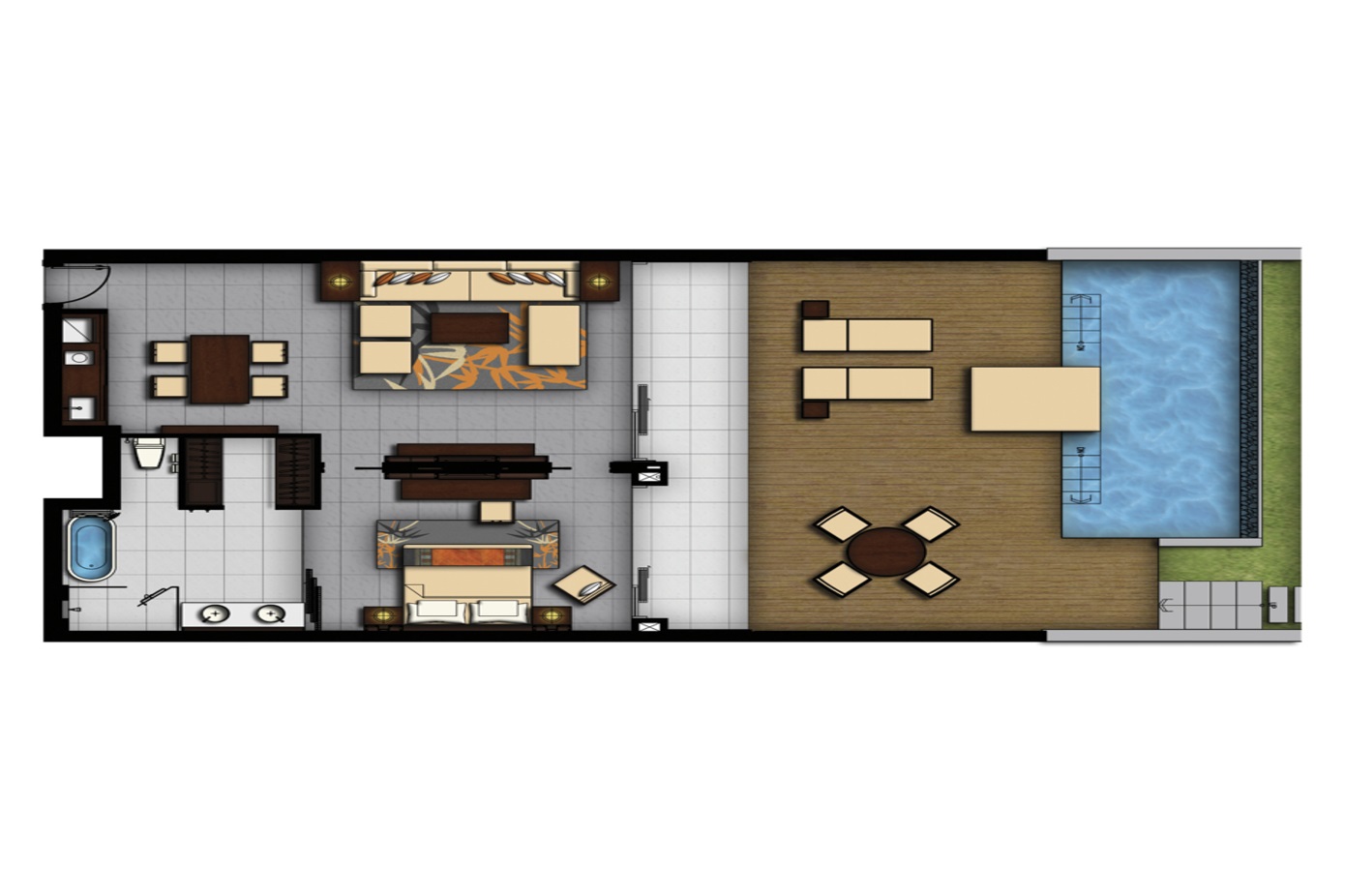 Люкс с 2-мя спальнями: одна – с двуспальной кроватью king size, вторая – с 2-мя односпальными кроватями; 2 ванные комнаты, каждая с ванной и душем; отдельная гостиная с зоной отдыха, обеденной зоной на 6 персон и мини-кухней с раковиной и микроволновой печью, меблированная терраса с обеденной зоной на открытом воздухе (на 4 персоны), частный бассейн, вид на территорию курорта; план номера;