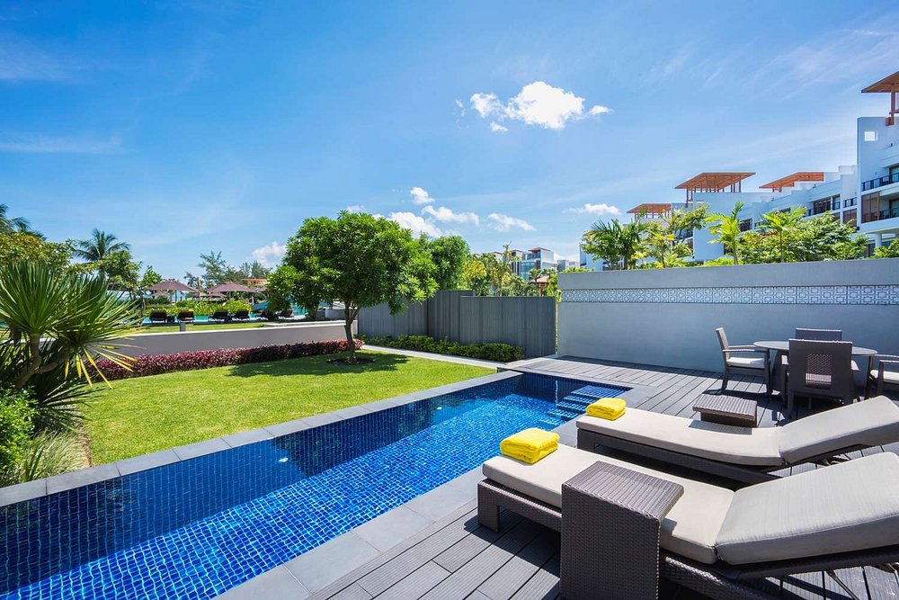 В просторном люксе: отдельная спальня с двуспальной кроватью king size, отдельная гостиная с обеденной зоной и мини-кухней с раковиной и микроволновой печью, ванная комната с ванной и душем, меблированная терраса с шезлонгами и собственный бассейн, вид на территорию отеля; план номера;