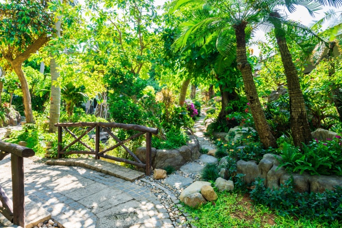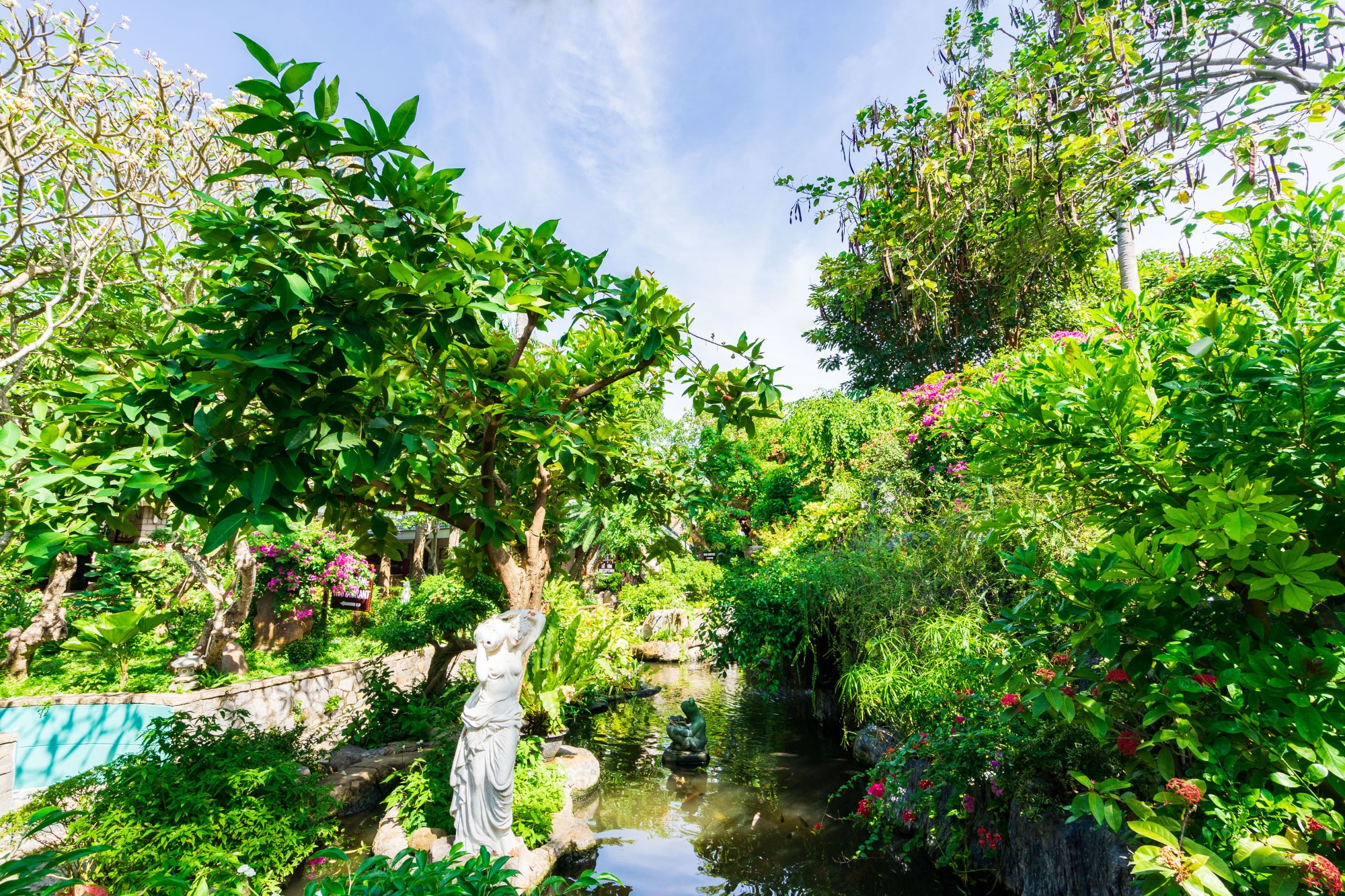 На территории расположены пруды с карпами Кои, искусственные водопады и ручьи, создающие живописные уголки для отдыха и фотосъёмки.