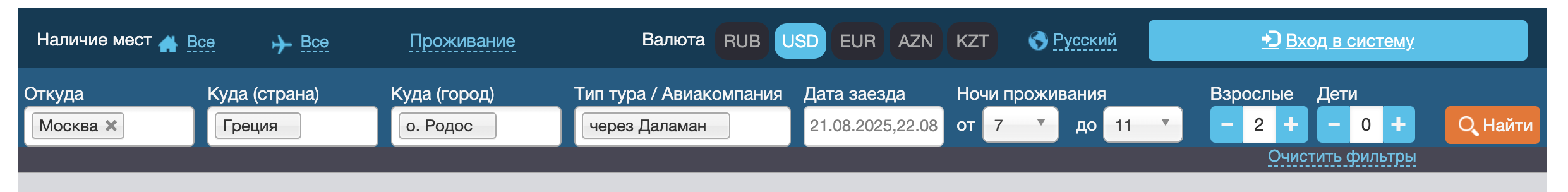 1. Выбирайте в параметрах поиска: Греция – Родос – тип тура «Через Даламан»: